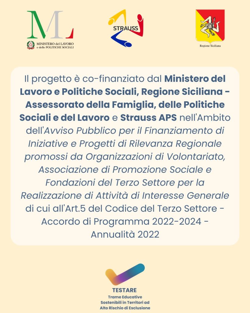 👉Il progetto è co-finanziato dal Ministero del Lavoro e Politiche Sociali, Regione Siciliana – Assessorato della Famiglia, delle Politiche Sociali e del Lavoro e Strauss APS.
